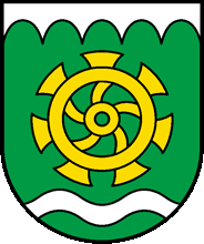 Blasonierung: In Grün über silbernem Wellbalken ein goldenes Mühlrad mit fünf gebogenen Armen und sieben Zellen, silberner Schildhauptbalken mit Schuppenschnitt. De sinople à la roue de moulin à cinq bras ployés sénestrogyres et sept augets, le tout d’or, accompagnée en pointe d’une divise ondée d’argent, au comble engrêlé de quatre pointes et deux demies du même (selon M. Nicolas Vernot, auteur d'armoiries). |