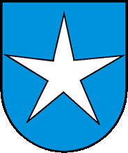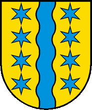 Blasonierung: In Gelb blauer Wellenpfahl, beseitet von je vier sechsstrahligen blauen Sternen.