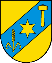 Blasonierung: In Gelb Schräglinksbalken, belegt mit sechsstrahligem gelbem Stern in der Mitte, beseitet von Bergmannsschlägel und Kornähre, beide gelb.