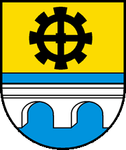 Blasonierung des neuen Wappens: Geteilt von Rot mit 7 fünfstrahligen gelben, sparrenmässig angeordneten Sternen und von Blau mit dreibogiger weisser Brücke, über allem gelber Schlüssel mit Doppelbart.