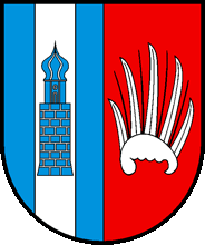 Blasonierung: Gespalten von Blau mit weissem Pfahl, belegt mit gefugtem blauem Schlossturm mit Zwiebeldach und von Rot mit weissem Flügel.
