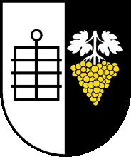 Blasonierung des offiziellen Wappens: Gespalten von Weiss mit schwarzem Rost und Schwarz mit gelber Traube mit weissen Stiel und zwei weissen Blättern.